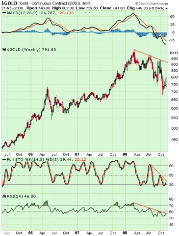 Until recently, it has been difficult to play commodities in anticipation of reflation given prevailing downtrends. Gold has held up better than most but it too is still caught in a downtrend of lower lows and lower highs. The recent weakness in the dollar has perked gold back up, and I am sticking to it as one of my favorite places to be for 2009.